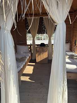 Es gibt Pavillons am Strand, die man buchen kann. Man bekommt ebenfalls den ganzen Tag Getränke gebracht. Vielen Dank an Mehmet für den exzellenten Service! ❤️