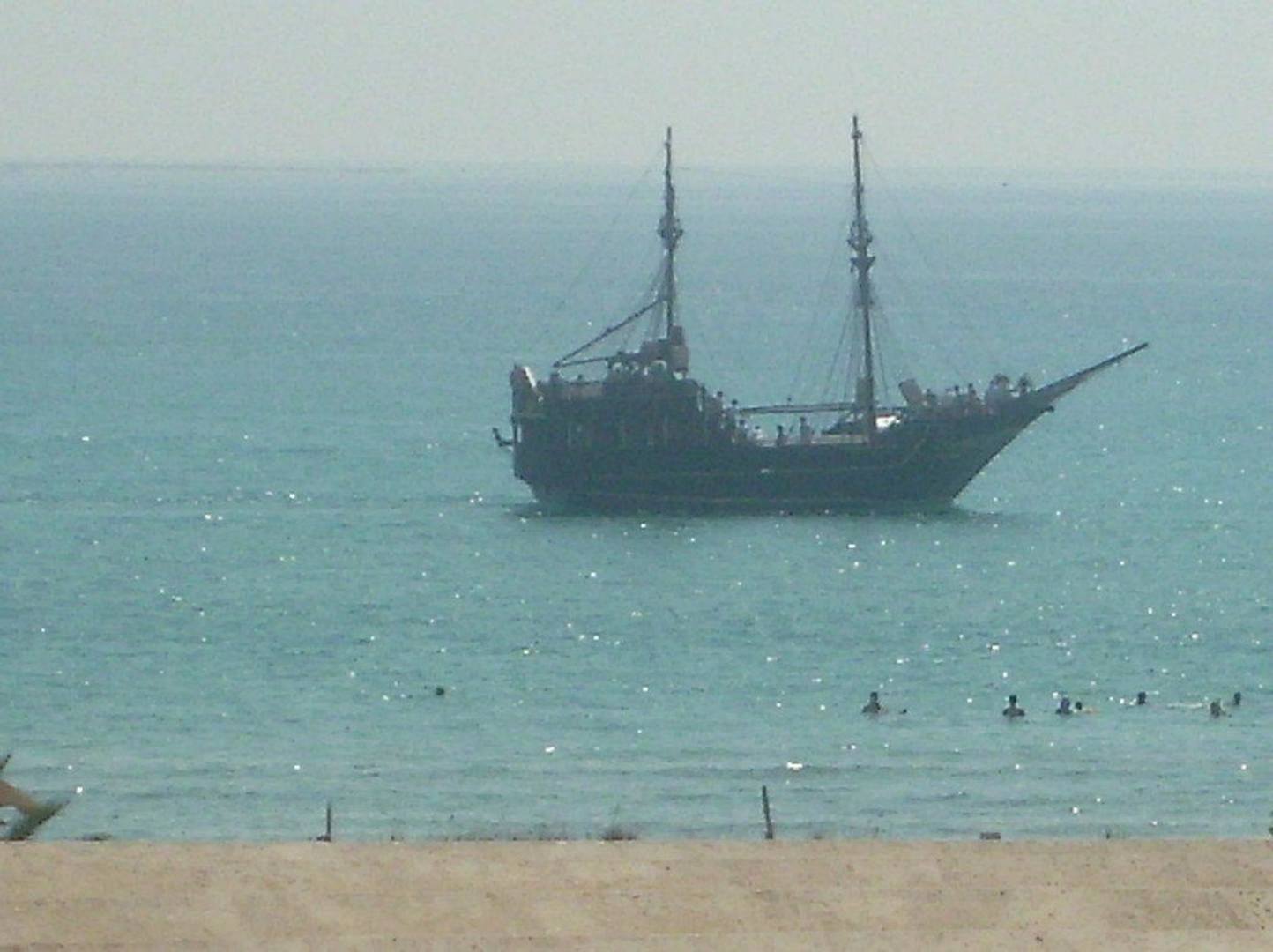 Piratenschiff vor dem Hotelstrand.