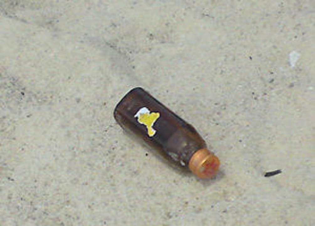 Auch diese Flasche (mit noch weiteren) lag bis zu unserer Abreise (3 Wochen) am Strand. Papierkörbe gibt es nicht, daher muss der Müll eben liegen bleiben.