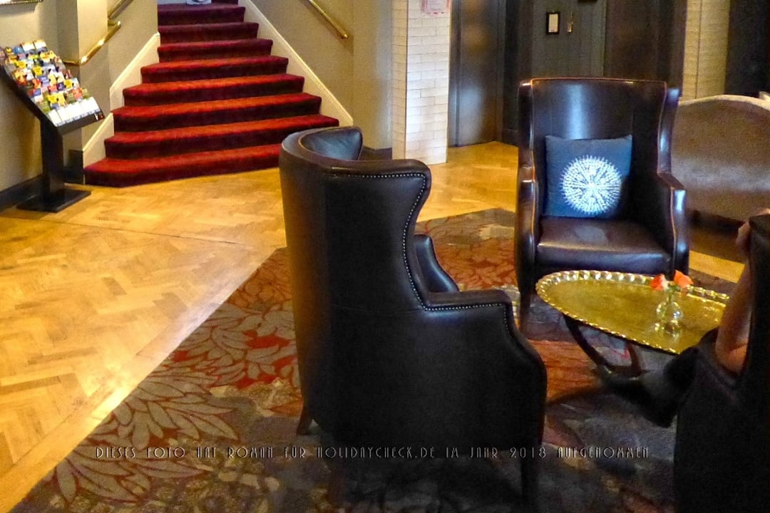 Eine Sitzgelegenheit gegenüber von Rezeption, Treppenaufgang und den beiden Lifts.