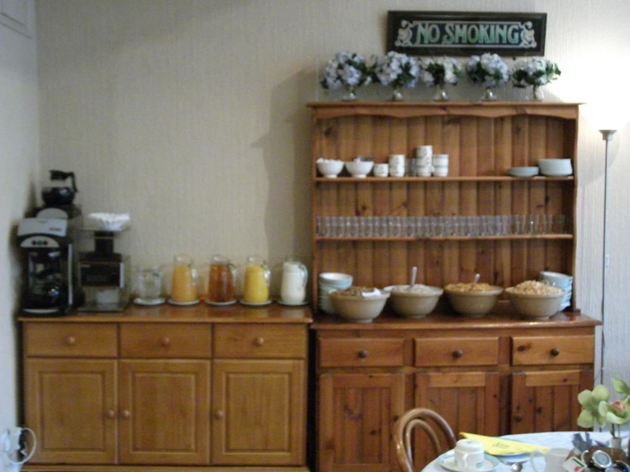 Hier kann man sich an Cornflckes und Saft bedienen.