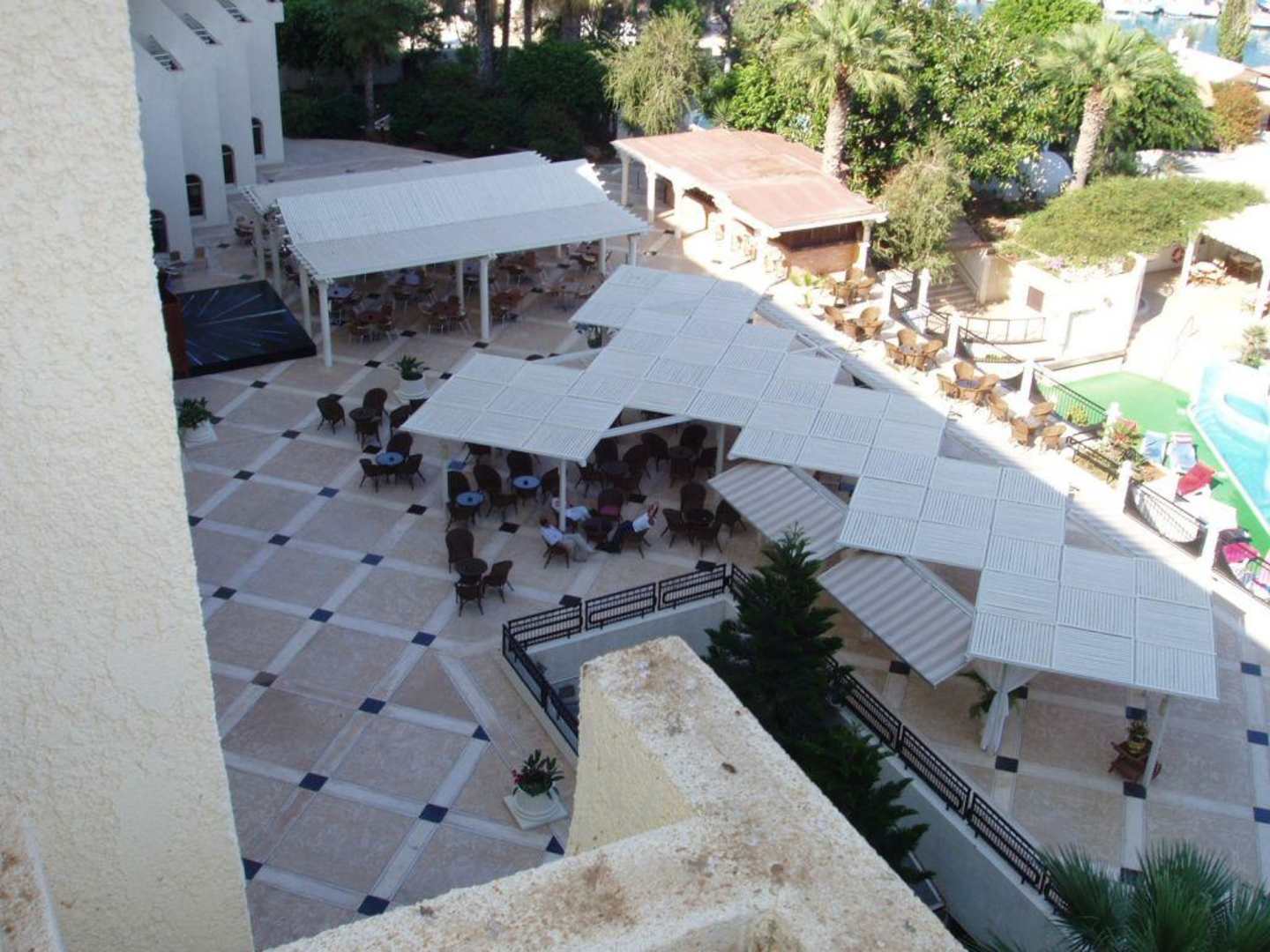 Blick aus dem 4. Stock auf die Terasse mit Bar