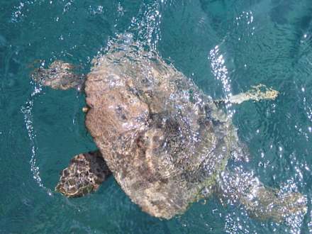 WasserschildkröteDirekt am Hotelstrand rechts in der Ecke Bootssteg + Restaurant leben vier Wasserschildkröten.