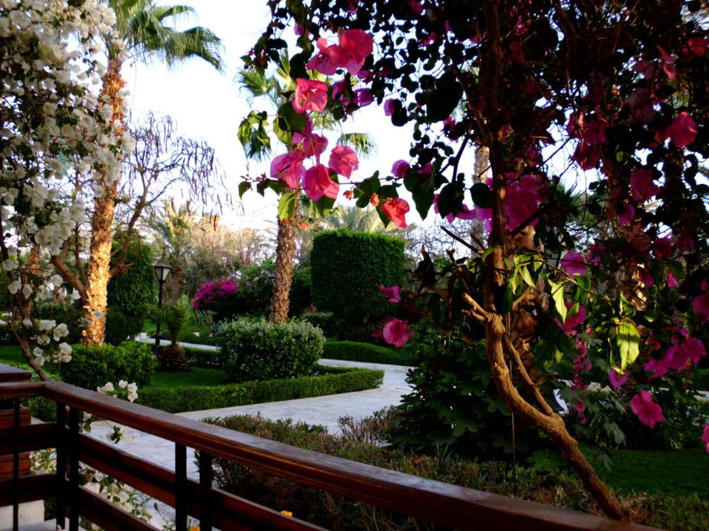 Blick aus dem Hotelzimmer in über die Terasse auf die Parkanlage