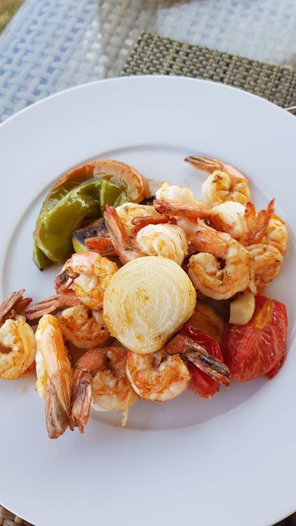Das war ein Mittagessen um Strandrestaurant . Mega Garnelen auf Gemüsebett