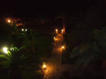 Am Abend wurde die ganze Aussenanlage beleuchtet. Hier schaut man wieder von unserem Balkon in den Garten und den Strand.