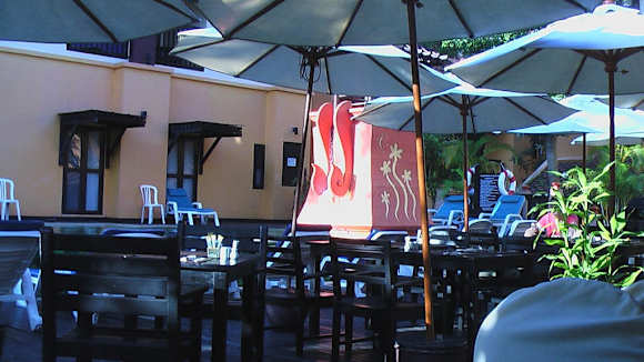 Bei schönen Wetter sitzt man lieber im freien und ißt sein Frühstück. Falls es doch mal regnen sollte , flüchtet man sich in den überdachten Bereich.