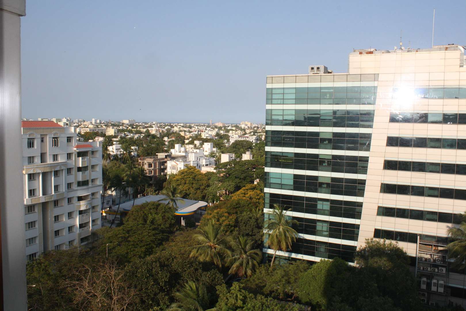 Da die Sonne sehr bald auf die große Fensterfront schien, mussten die schweren Gardinen leider ca. 3/4 des Tages zugezogen bleiben, was das Zimmer sehr düster machte.