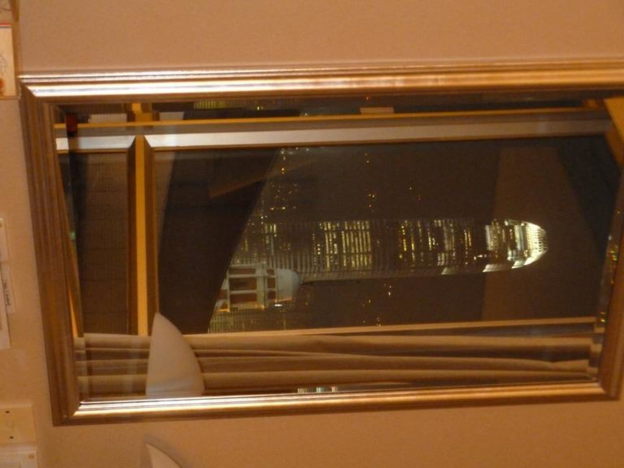 Das Foto zeigt die Skyline am Abend im Spiegel des Hotelzimmers