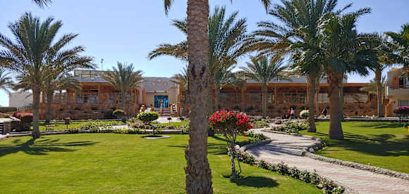 Blick vom Garten zum Haupthaus - rechts das Restaurant, links die Peanuts-Bar