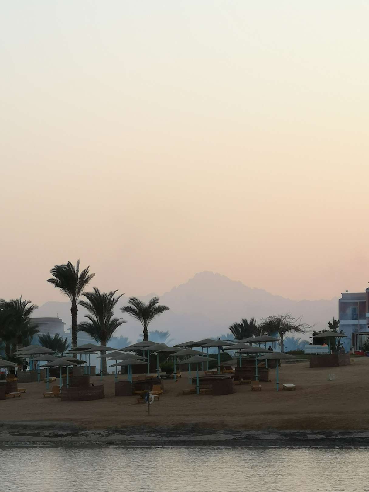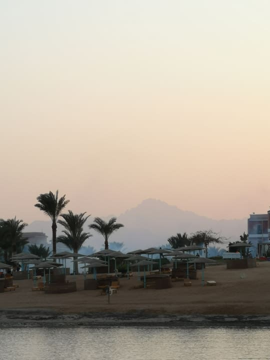 Ausblick vom Hotelsteg auf die Anlage bei Sonnenuntergang