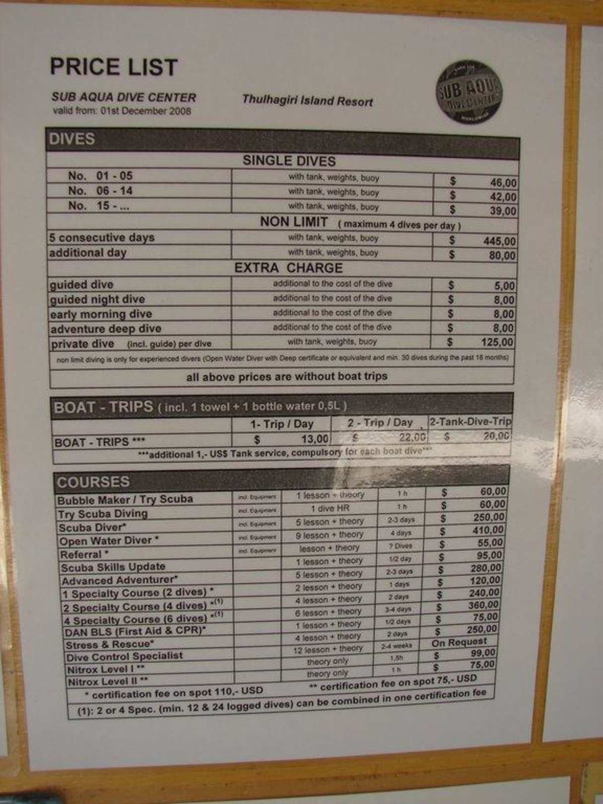 Preistafel Tauchen
