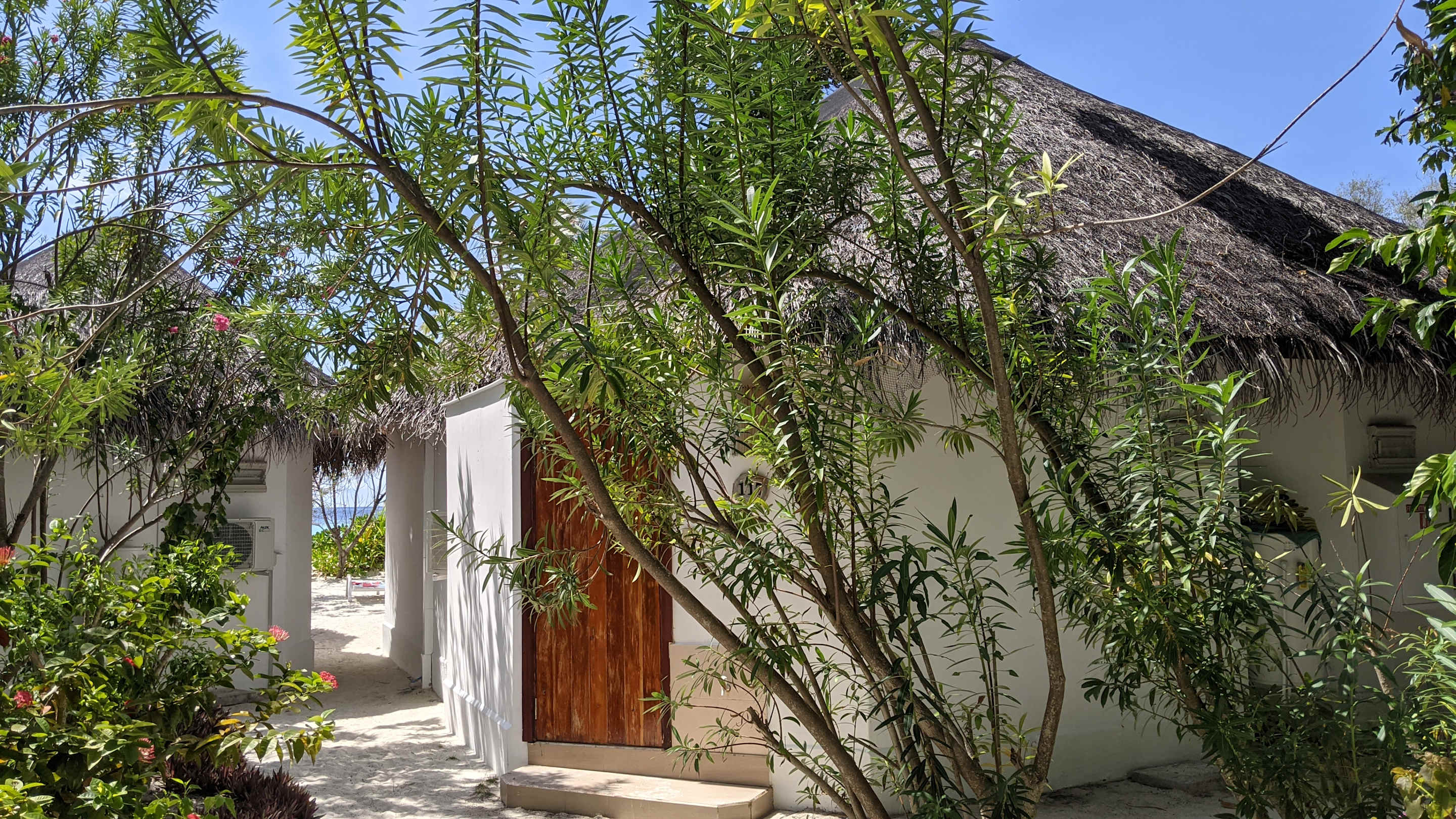 Rückseite mit EIngang zur Außendusche, rechts Bungi 117 (Doppelbungalow mit 118), links Bungi 116