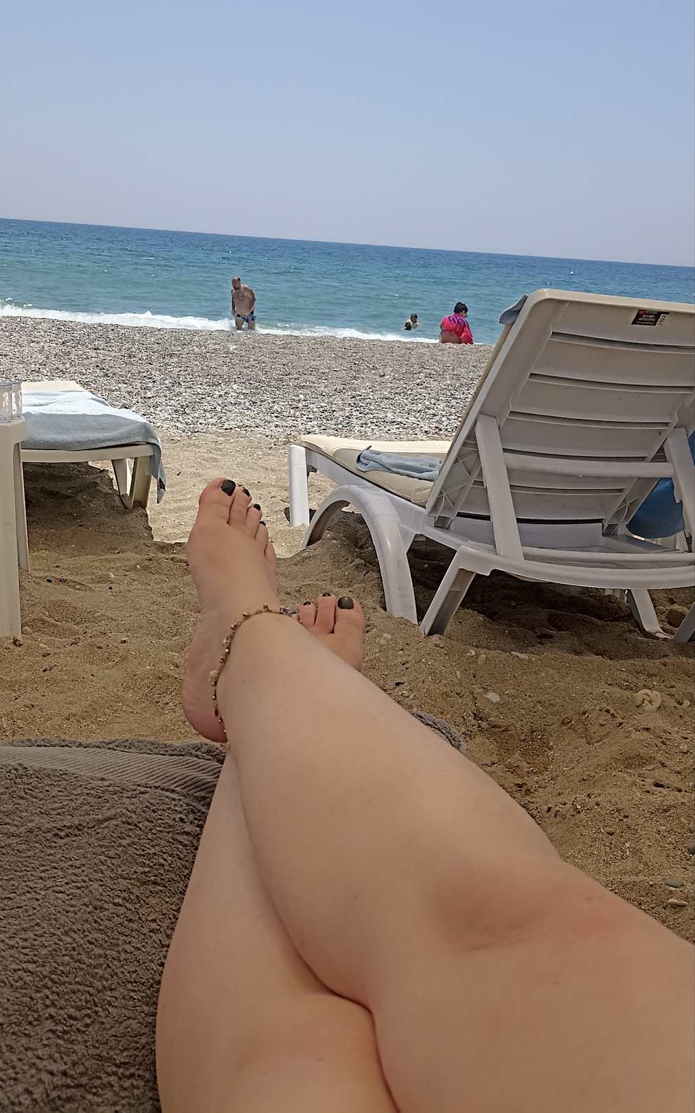Kieselstrand... Liegen überdacht...
