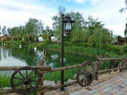 Blick zu den Tipis, Blockhütten, Planwagen