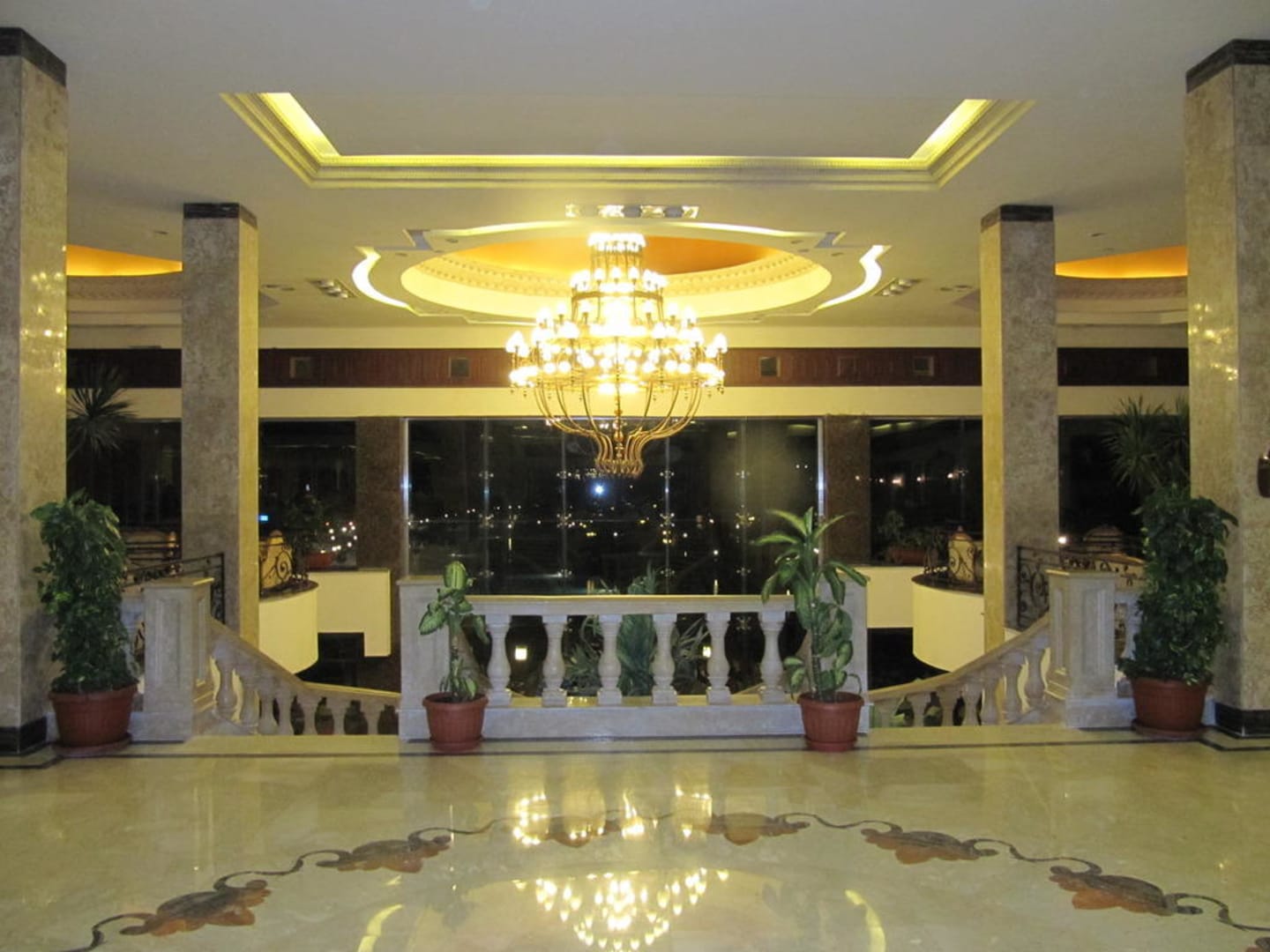 Ein Blick von der Lobby zu den in den Außenbereich führenden Marmortreppen am Abend