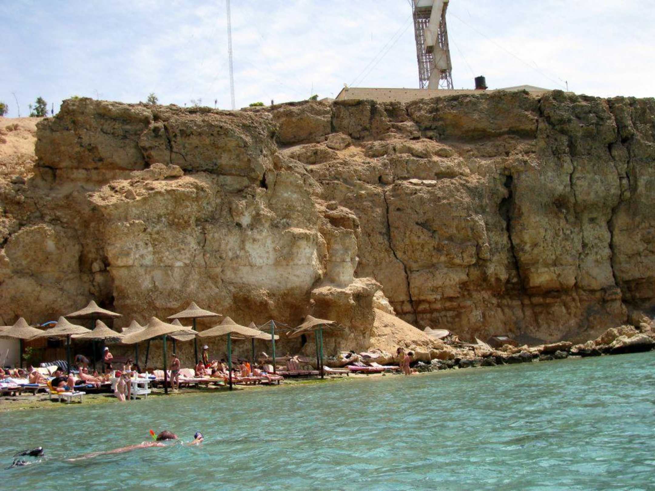 Widok na hotelową plażę. Ciasno, zniszczone leżaki. Ładna rafa!