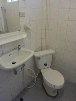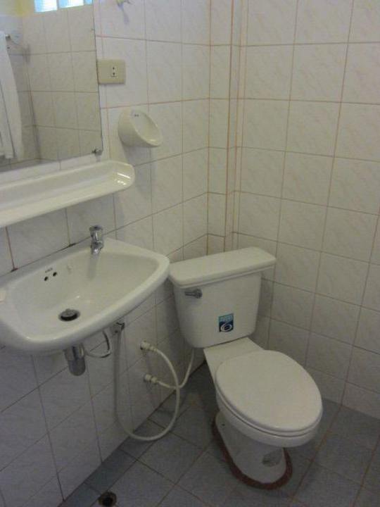 Familienbungalow - Duschbad mit Blick auf Toilette und Waschbecken