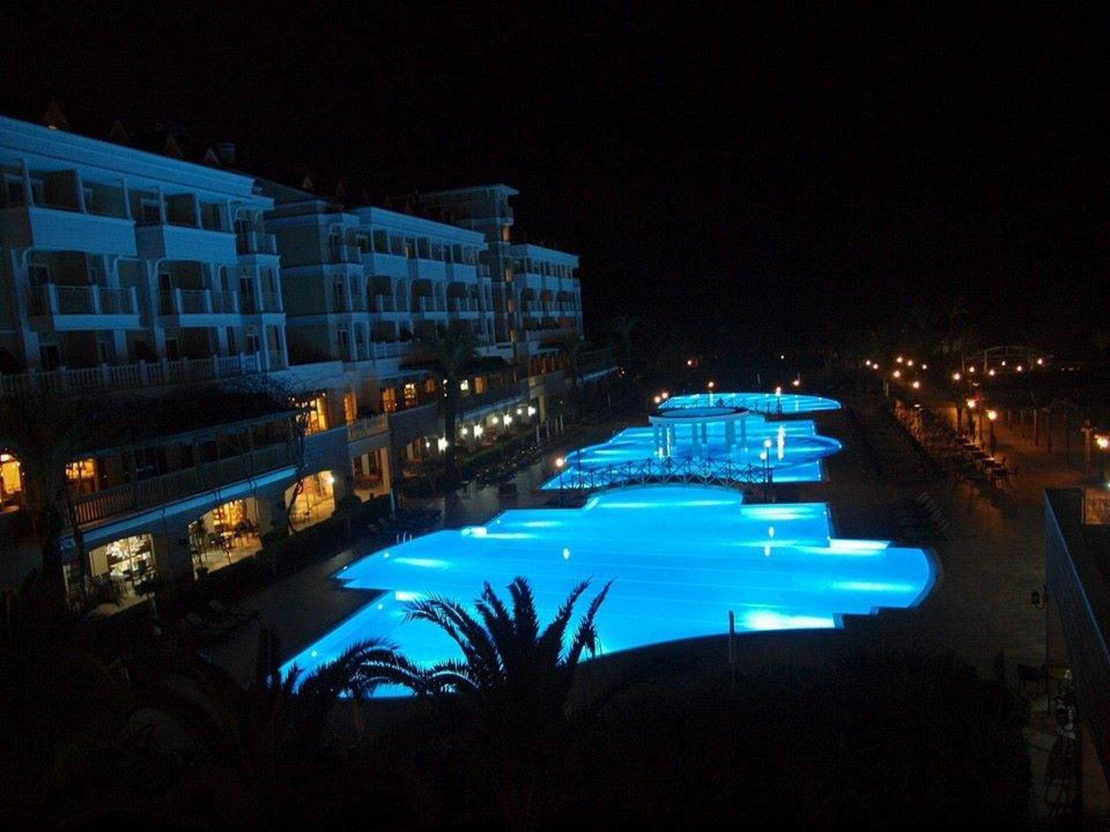 Pool, Poolterrasse und Hotel am Abend