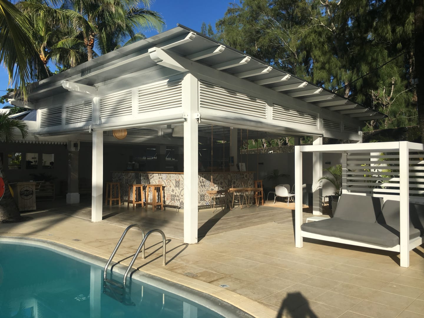 Pool, und im Hintergrund die Bar