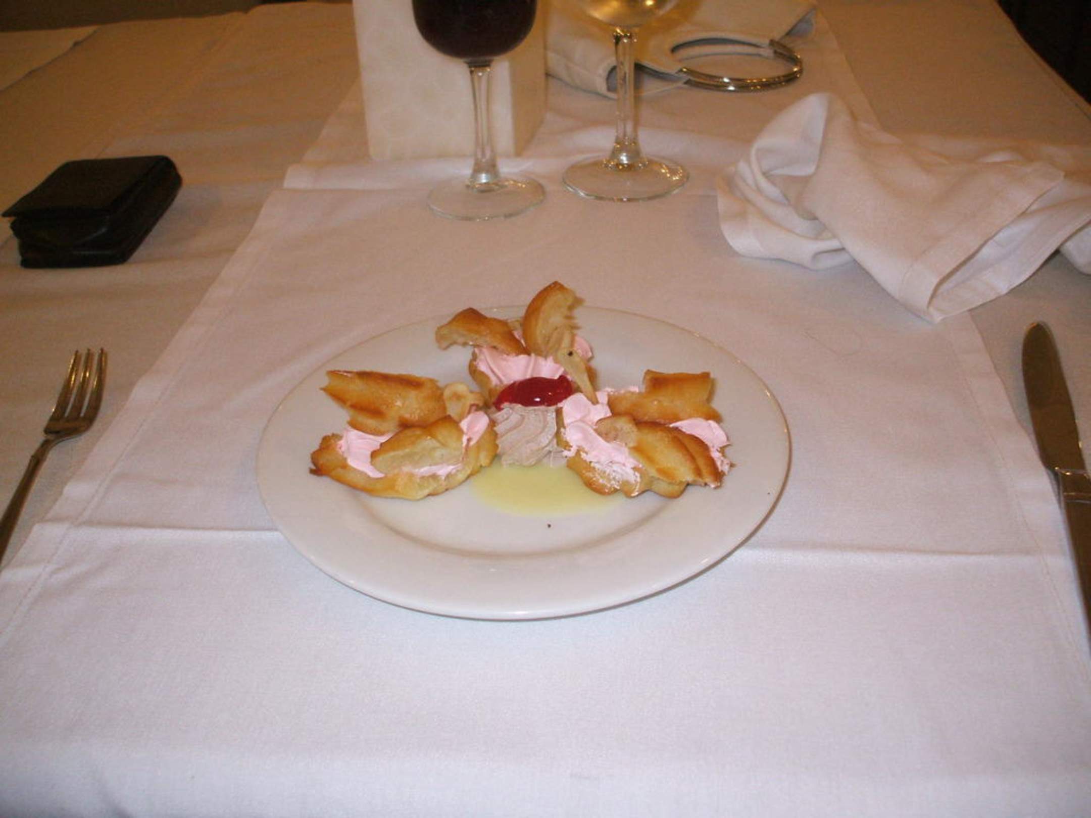 Ist Brandteig, gefüllt mit Himbeercreme auf einem Vanillespiegel! Lecker... aber kalorienreich.