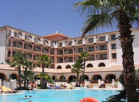Pool und Hotelrückseite vom Pinienwäldchen gesehen
