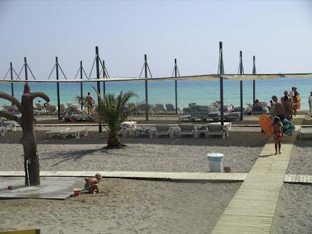 Strand mit Liegen und Sonnenschutz