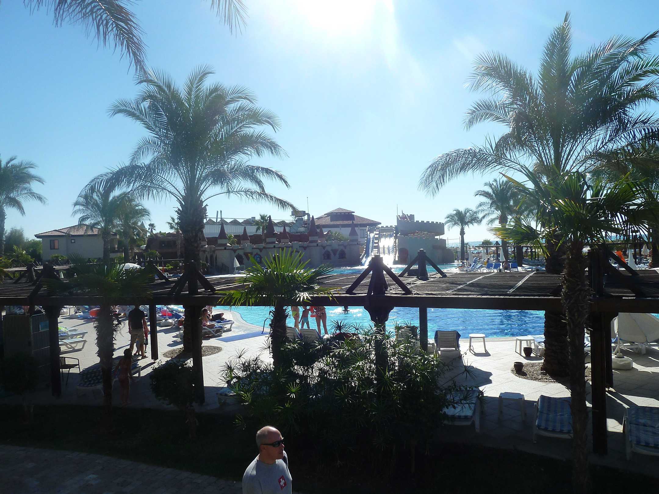 Blick vom Hauptrestaurant zum Pool