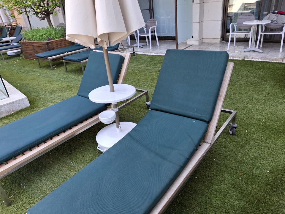 Liegen und Sonnenschirm am Balkon. Und auch noch Bestuhlung. Fand ich super