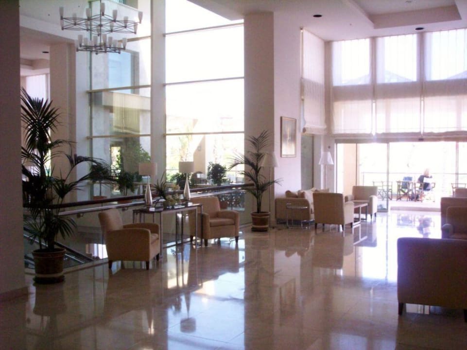 Rechter Teil der Hotellobby. Im Hintergrund die Außenterrasse über dem Poolbereich.
