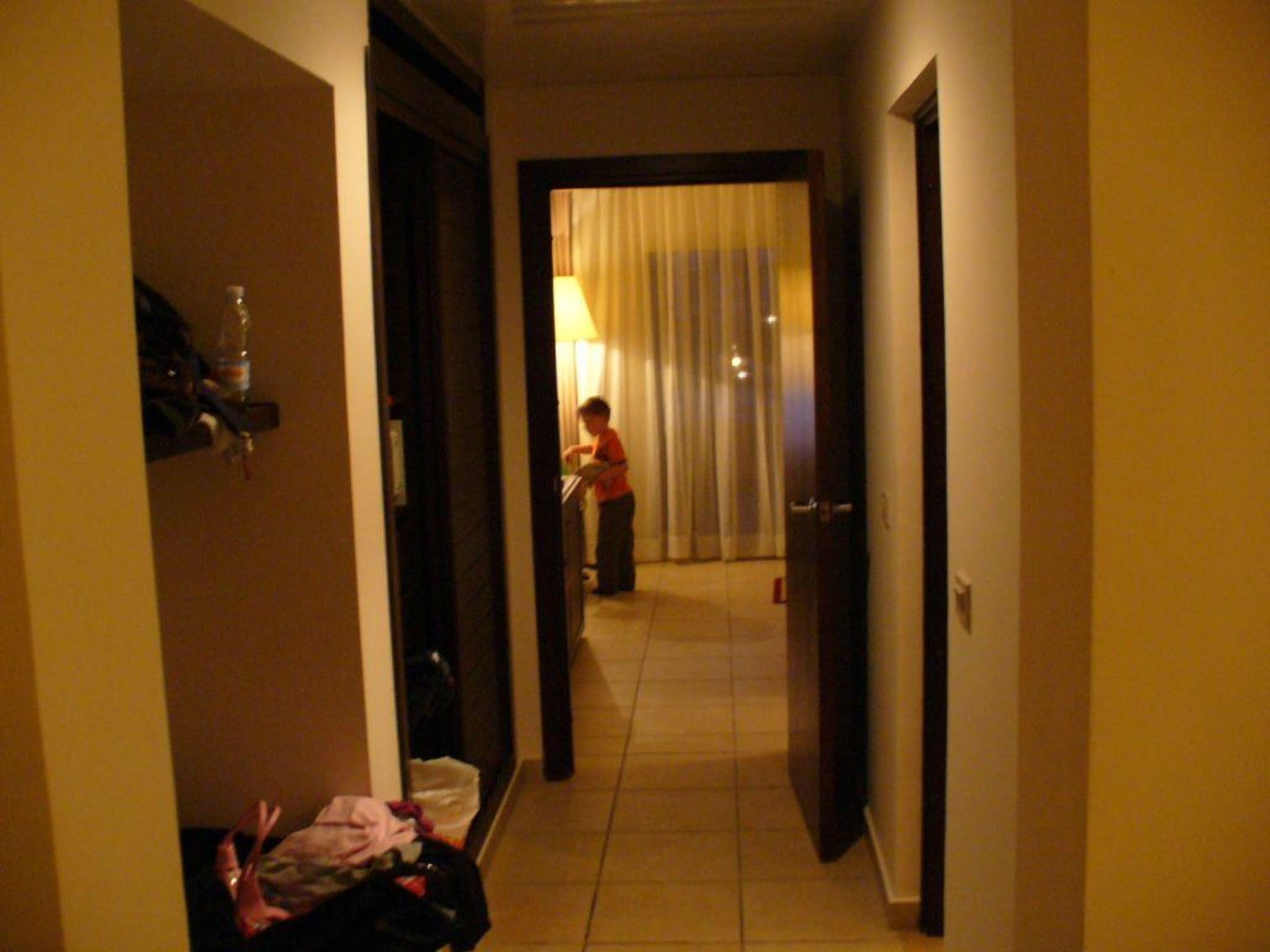 Hier sieht man den Durchgang von den Eizelbetten zu dem Doppelzimmer. Links sind schraenke und rechts geht man ins Bad rein. Im bad ist noch eine Tuer wovon man ins WC kommt.