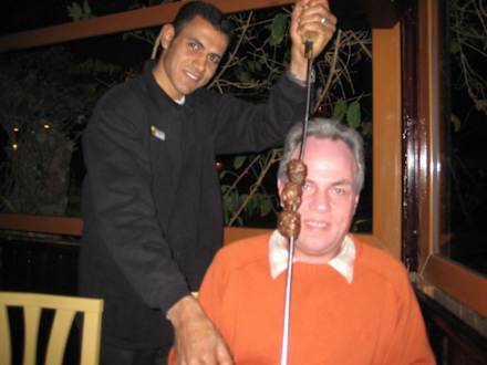 Ägypten, Sharm El Sheik, Nabq Bay, Hotel Magic Life, Südamerikanisches Spezialitätenrestaurant La Careta, der Kellner geht mit den verschiedenen gegrillten Spießen von Tisch zu Tisch