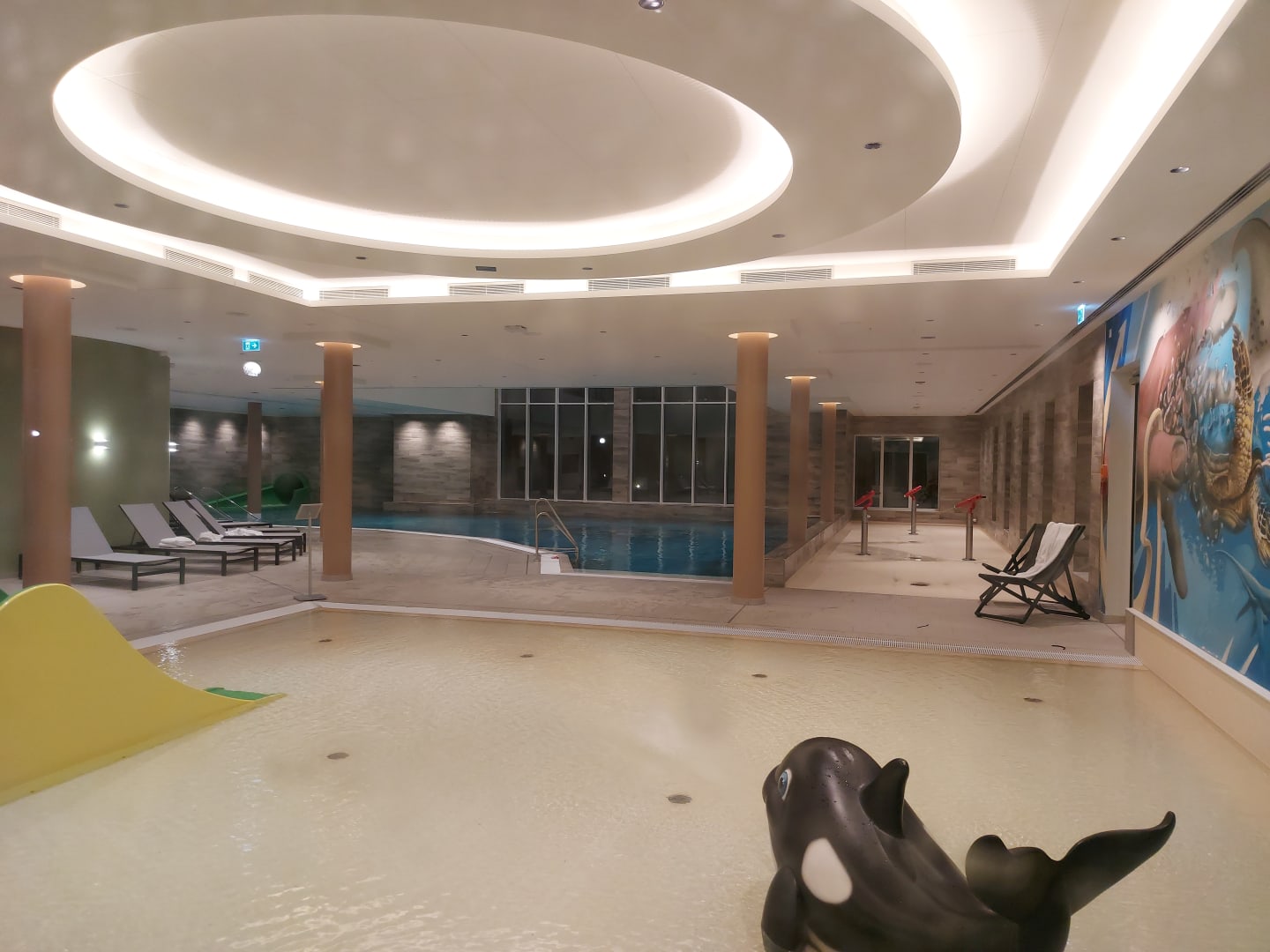 Grosses Hallenbad mit Rutsche von Außen. Babybecken mit kleiner Rutsche und Spielzeug.