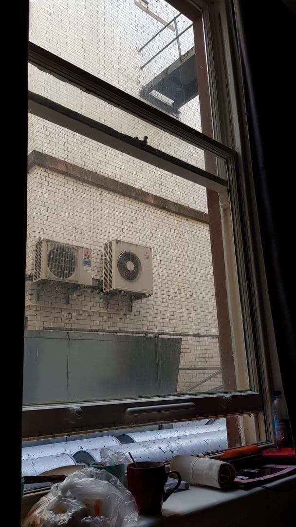 Einzige Ablage: Fensterbrett und ein kleiner Schreibtisch