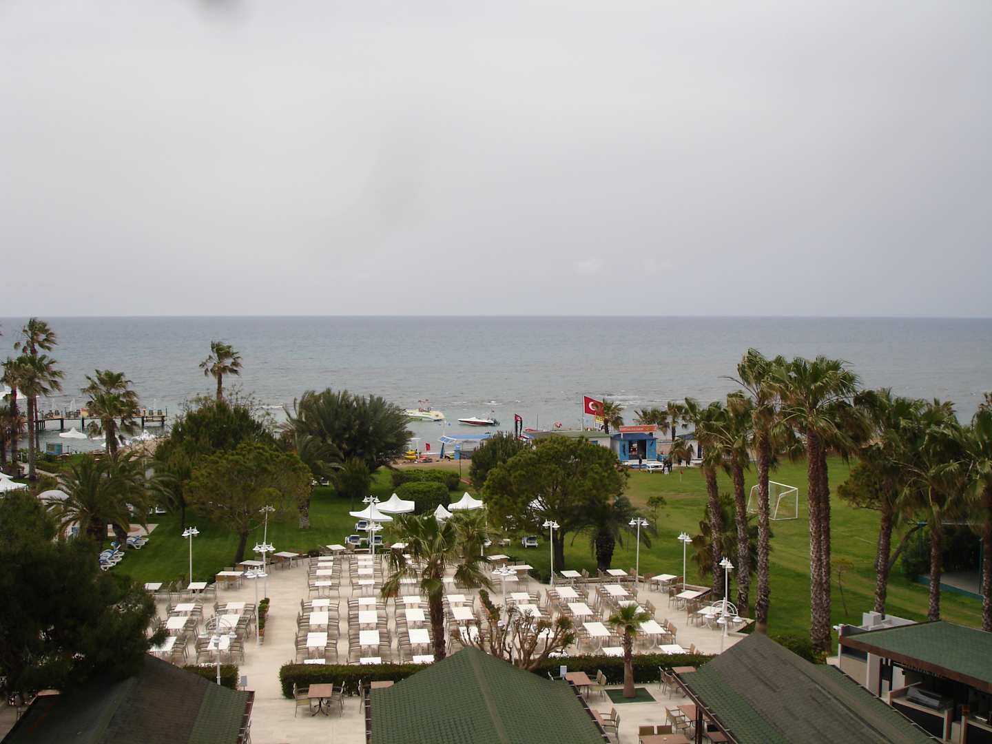 Aufnahme vom Balkon, 2ter Stock, unten Außenrestaurant, Strand, Fußballplatz