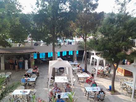 Der beliebteste Platzkaffe und softgetränke links mit blick ins pool und dann auch noch das einzige gute essen vom bistro rechts