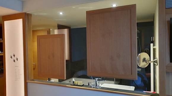 Blick vom Wohnraum in das offene Badezimmer