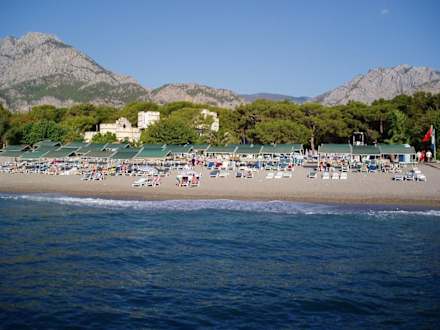 StrandTürkische Riviera, Göynük bei Kemer: " Kemer Holiday Village" ; Strand , zu sehen ist im Hintergrund ein Teil des Amphitheaters