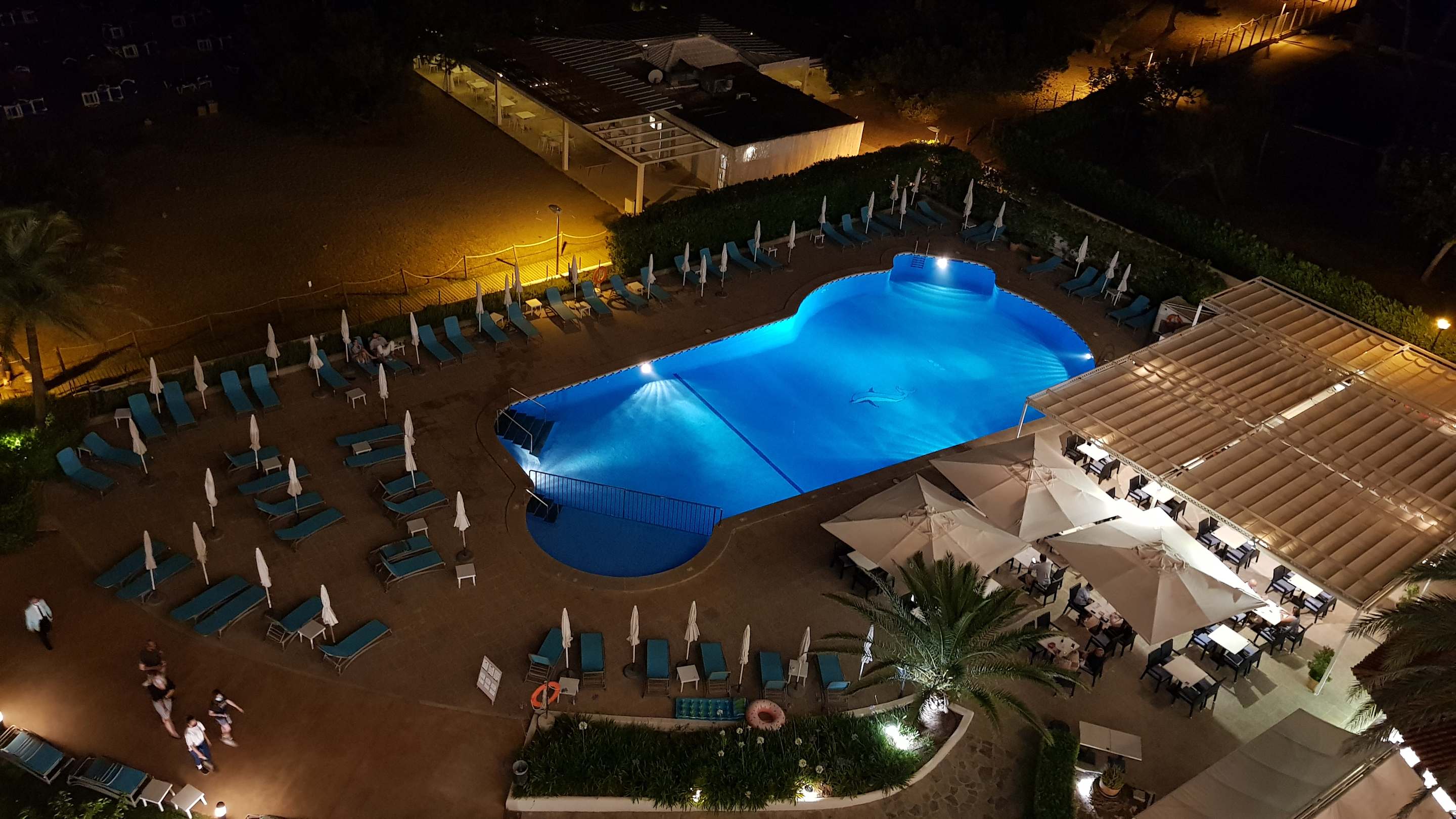 Von unserem Balkon auf Pool und Bar am Abend