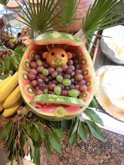 Puppenwagen mit Puppe aus frischem Obst