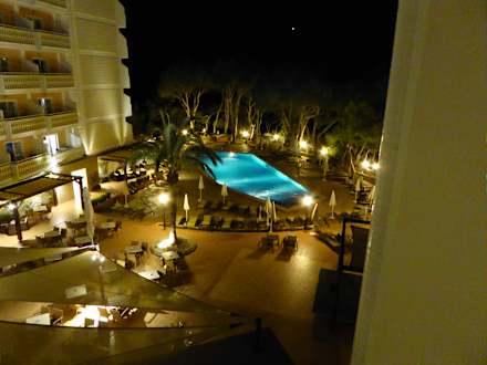 Abendlicher Blick auf die Außenterrasse und den Pool