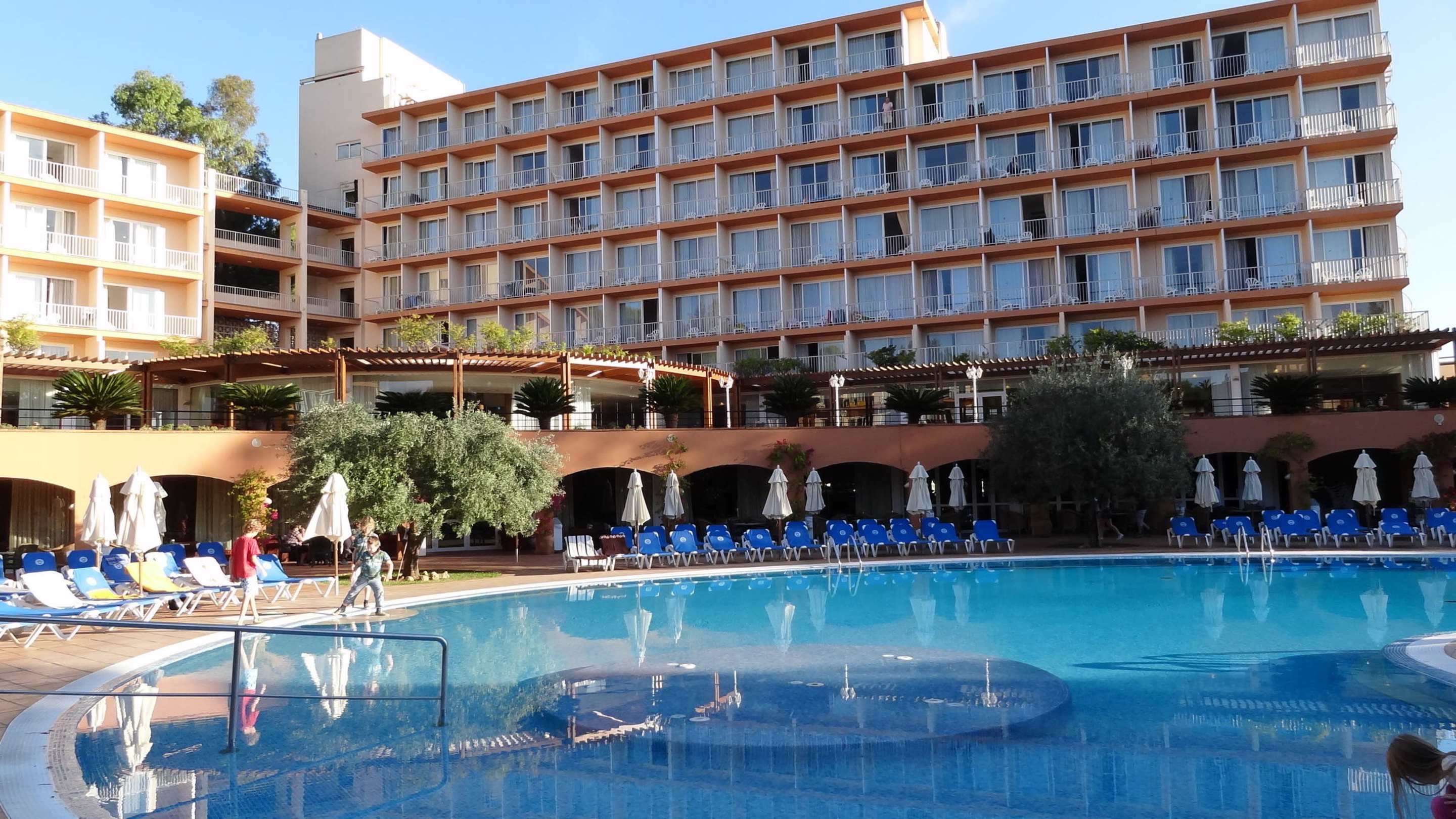 Blick vom vorderen Pool auf den Hauptkomplex