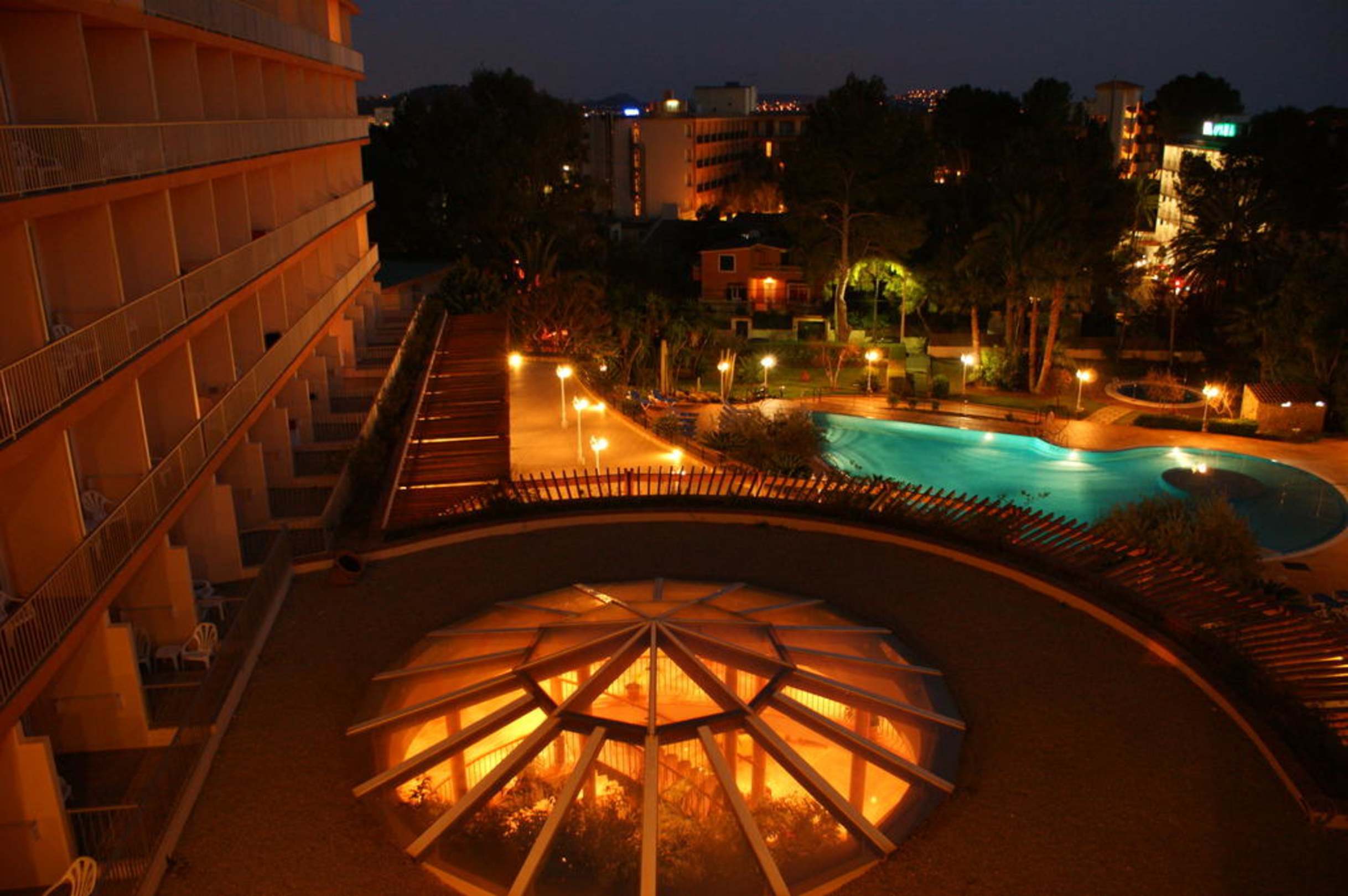 Pool- und Hotelanlage in der Abenddämmerung
