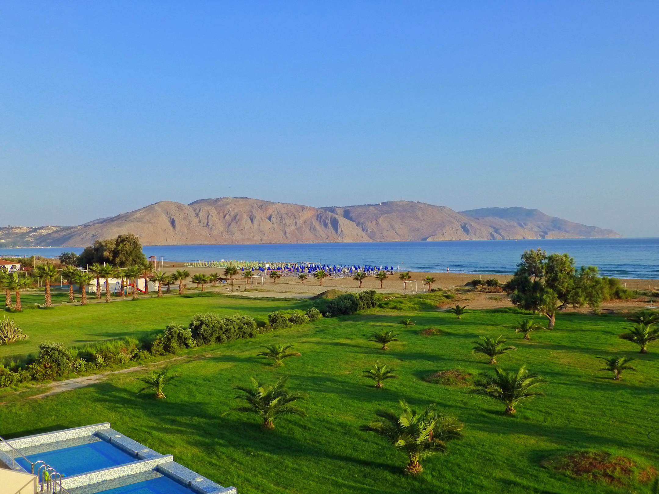 Ausblick vom Balkon zum Strand und Beachbar vom Nachbarhotel Delfina Beach.
