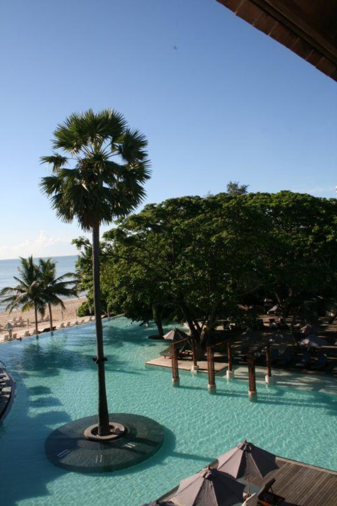 Blick vom Zimmer aus auf den Pool und das Meer.