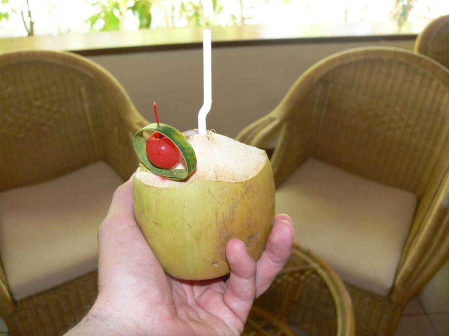 Solch einen herzlichen Empfang haben wir auch noch nie gehabt. Zunächst bekam jeder einen Blütenkranz und als Erfrischungsgetränk eine frisch geerntete Kokosnuss. Außerdem gab es noch feuchte Tücher.