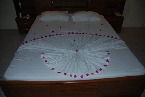 Łóżko w pokoju przystrojone płatkami kwiatów