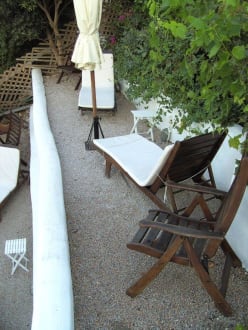 Bild 10 von Villa Katikies in Oia4 solcher Liegen und einige Stühle stehen auf zwei Terassen unterhalb des kleinen Pools max. 14 Personen zur Verfügung. Auf der Terasse des Jakutzis stehen weitere 5 einfache Stoffliegestühle (keine Auflagen).