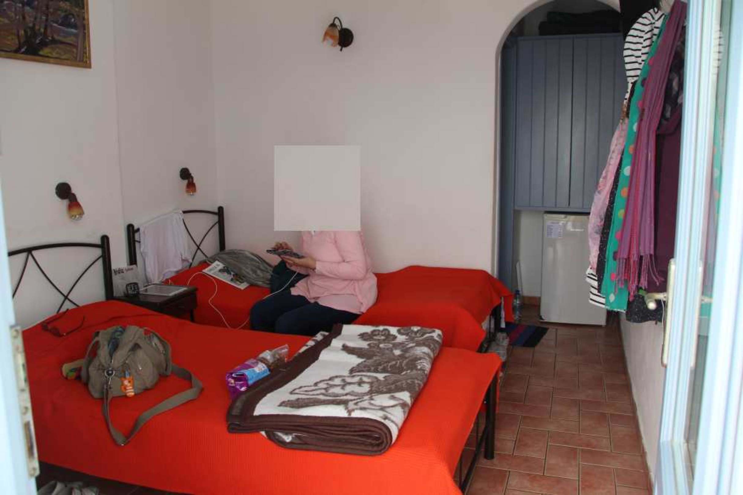 Zweibettzimmer, dahinter das Bad