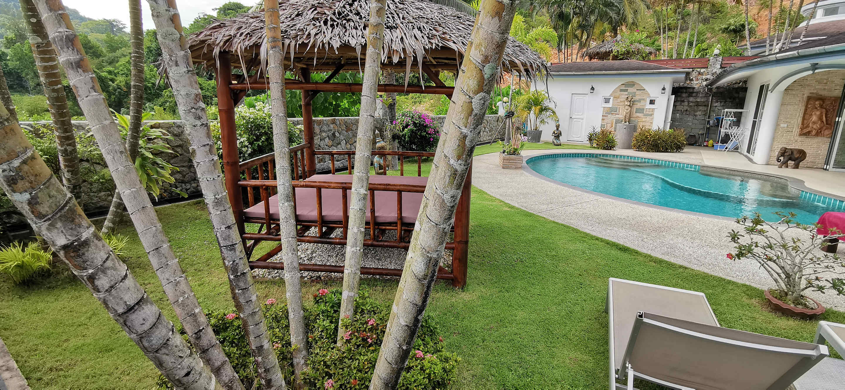 Villa SIAM: Außenansicht Villa Siam. Gelände mit Privatpool. Von außen nicht einsehbar. Rolltor zu und 100% privat :-). Zu sehen auch der Freisitz, ideal für relaxen oder Massagen oder...